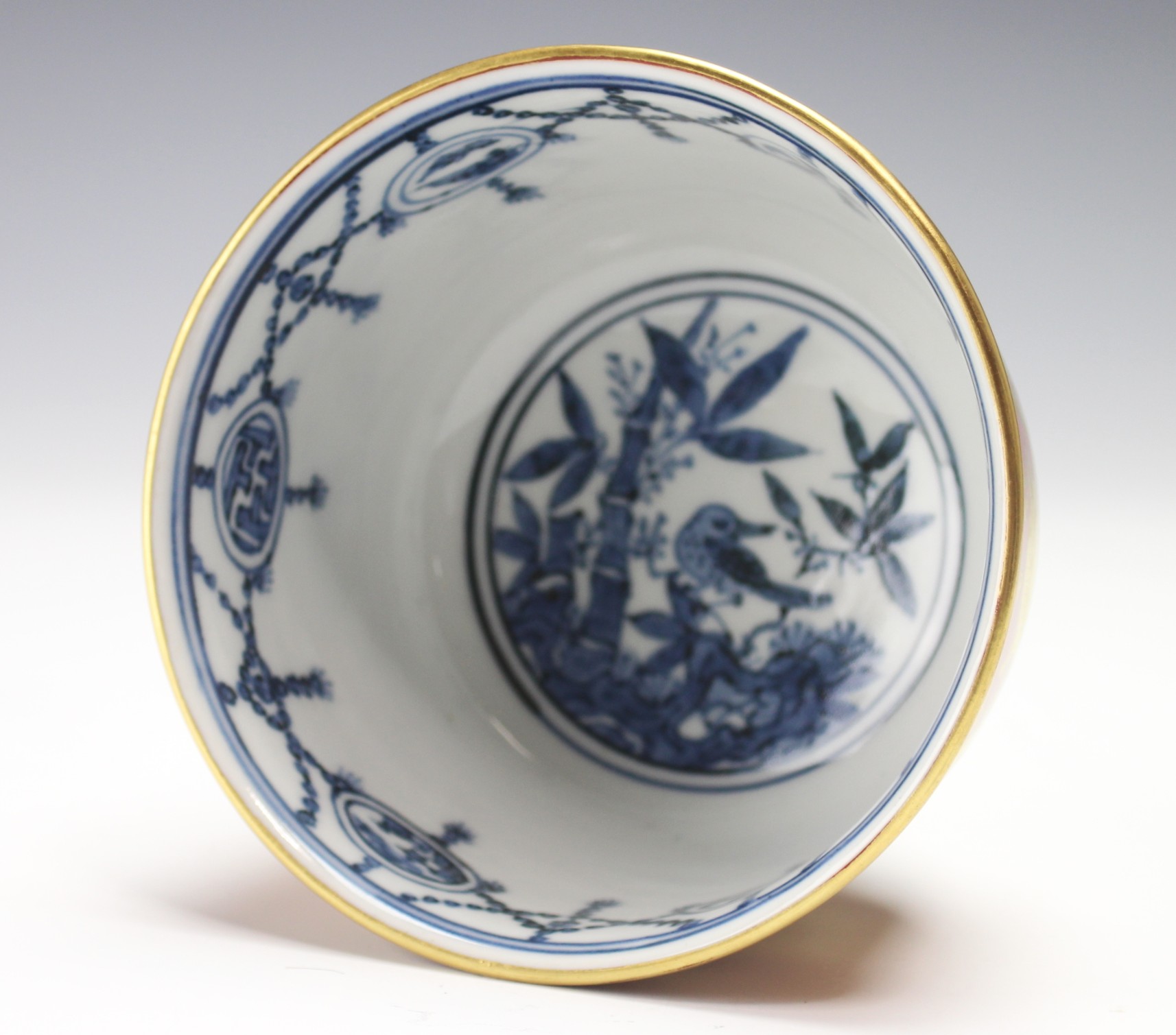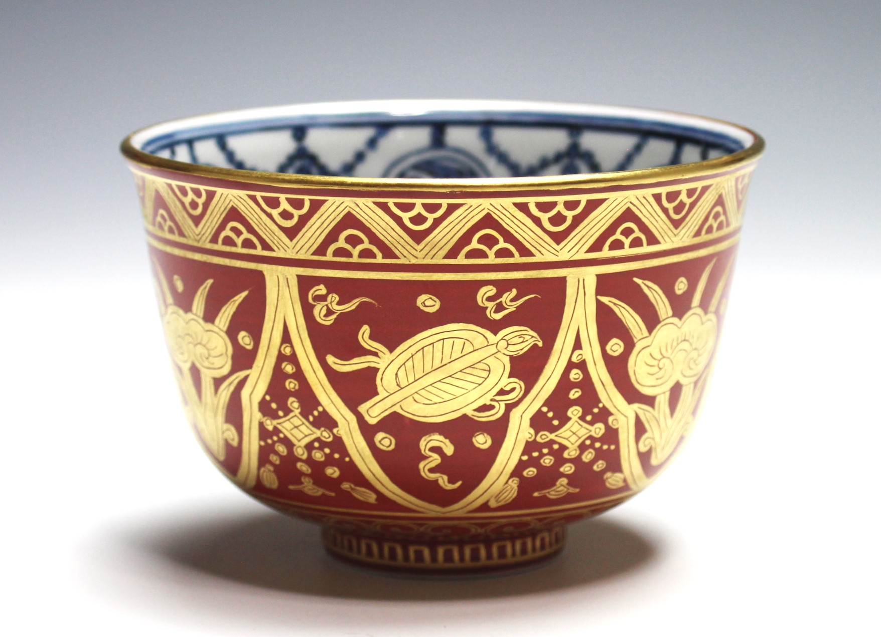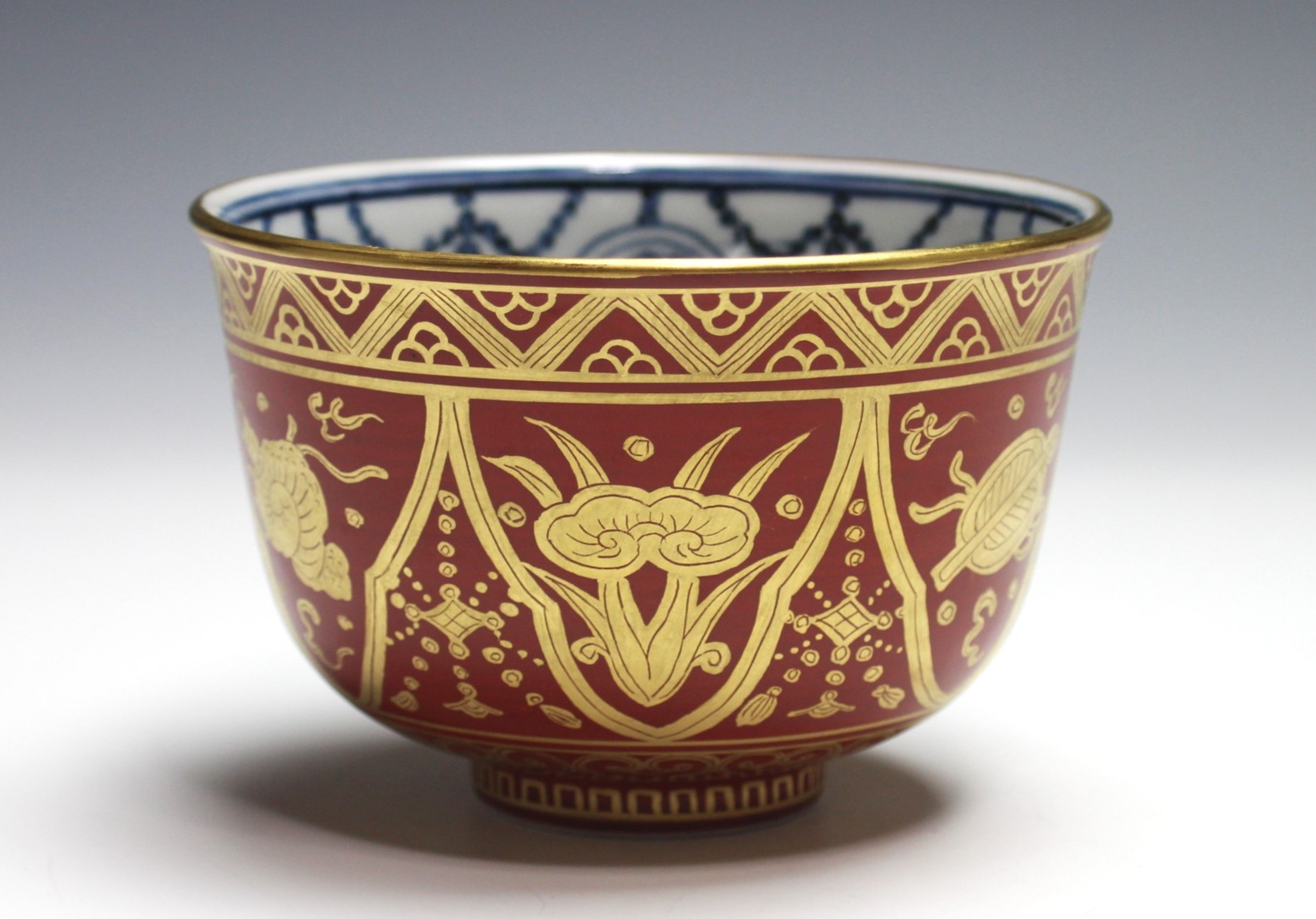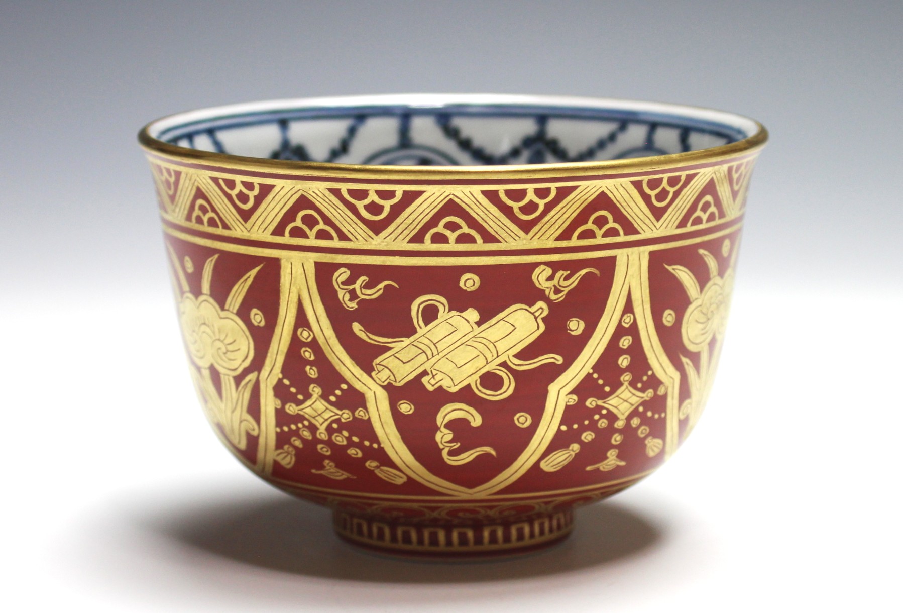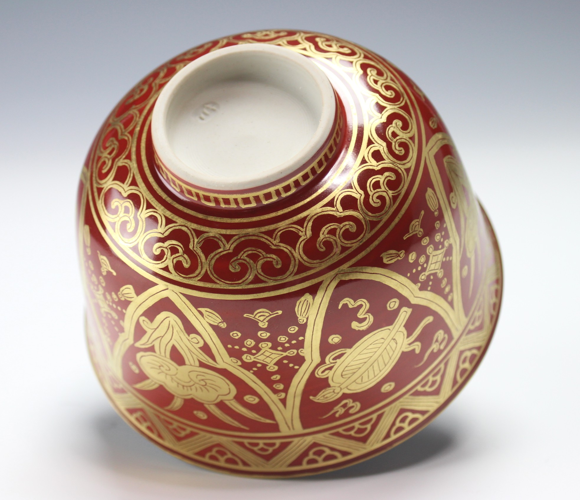 岩崎新定 膳所焼 金襴手茶碗 宝尽し iwasaki, shinjo zeze gold-painted bowl with drawings of luck-bringing items