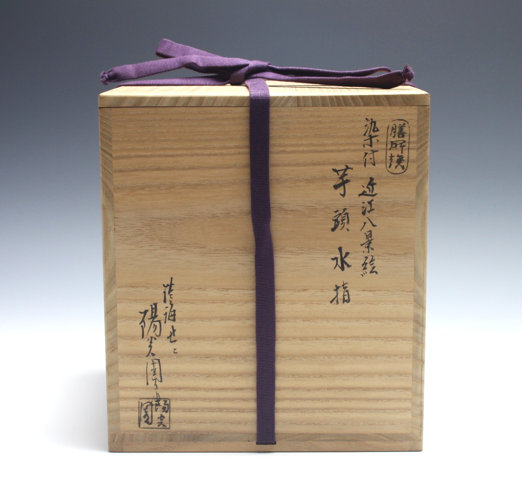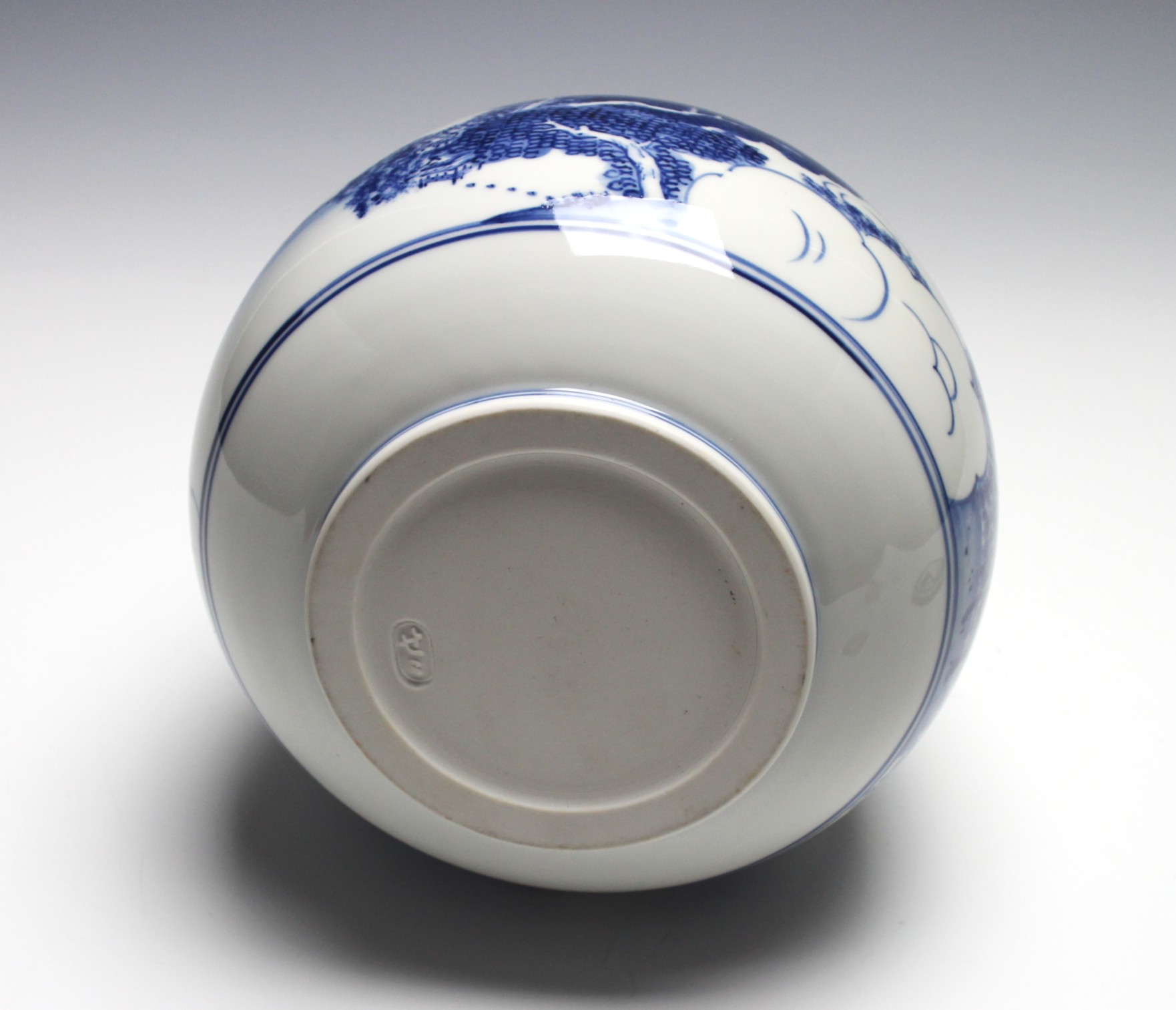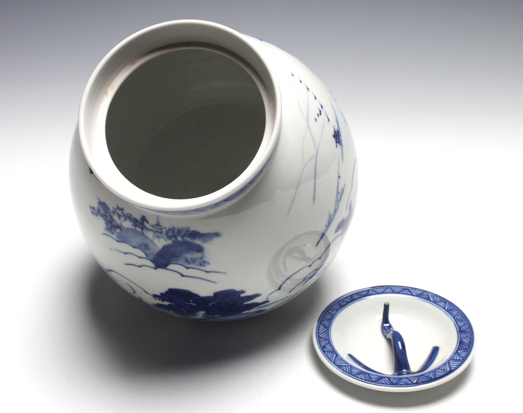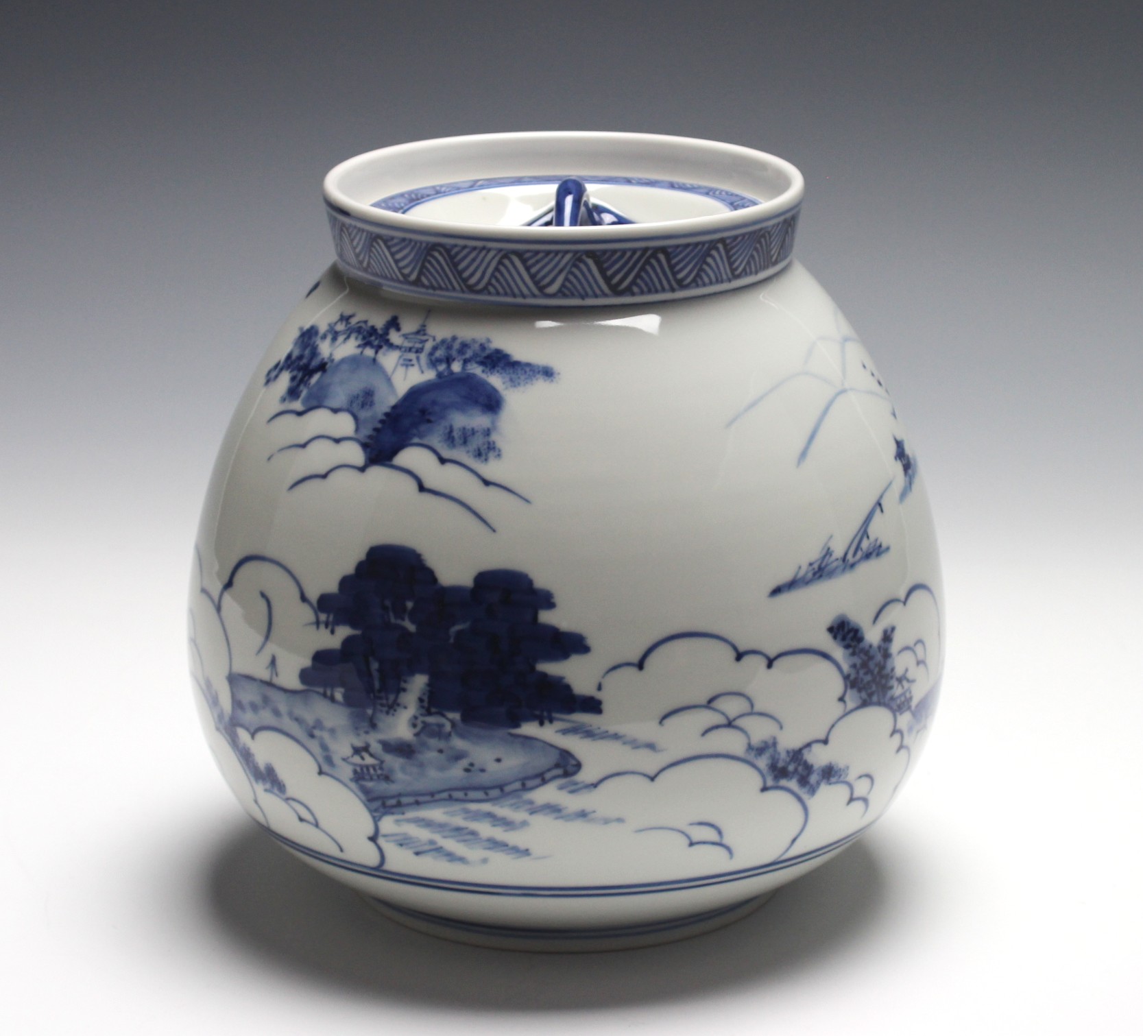 岩崎新定 膳所焼 染付近江八景絵芋頭水指 iwasaki, shinjo zeze tubercle shaped water jar with sometsuke (blue and white) eight views of omi