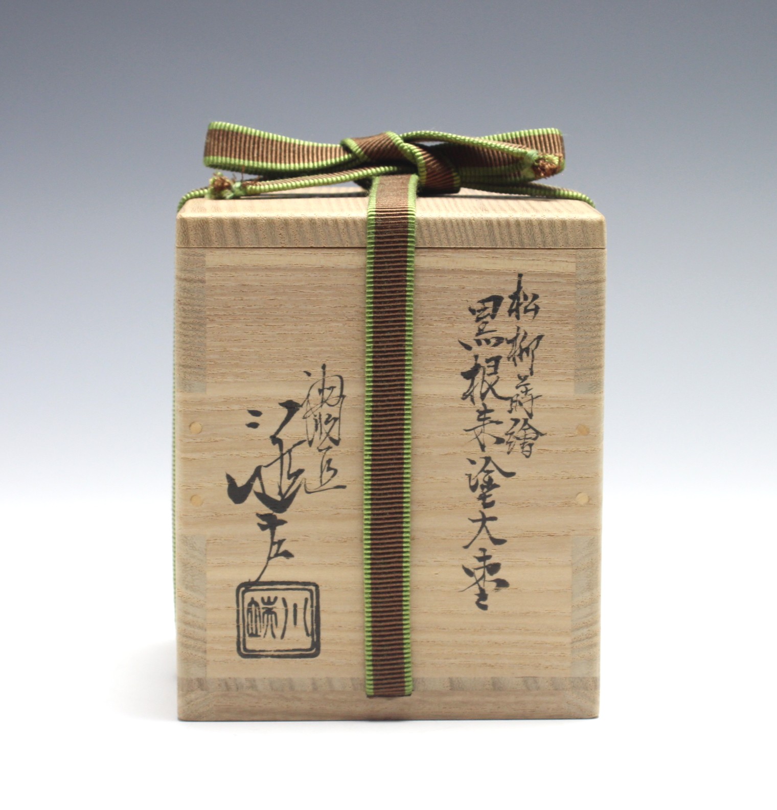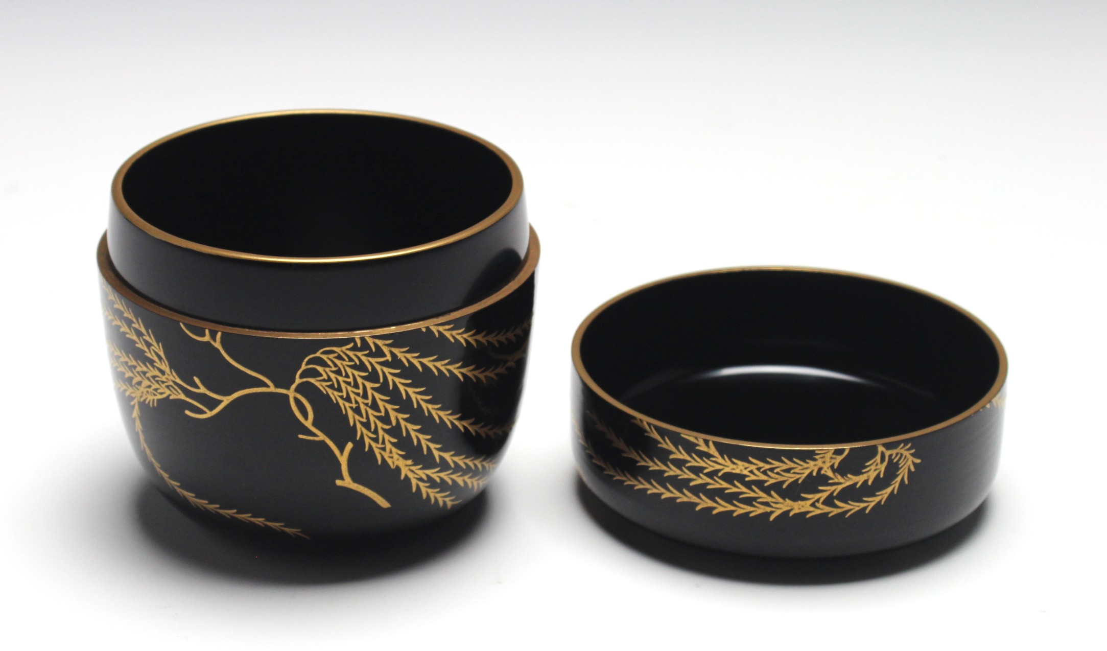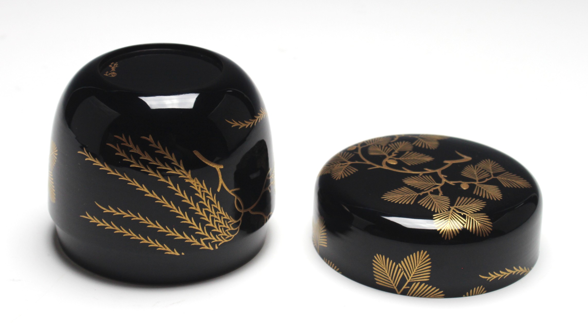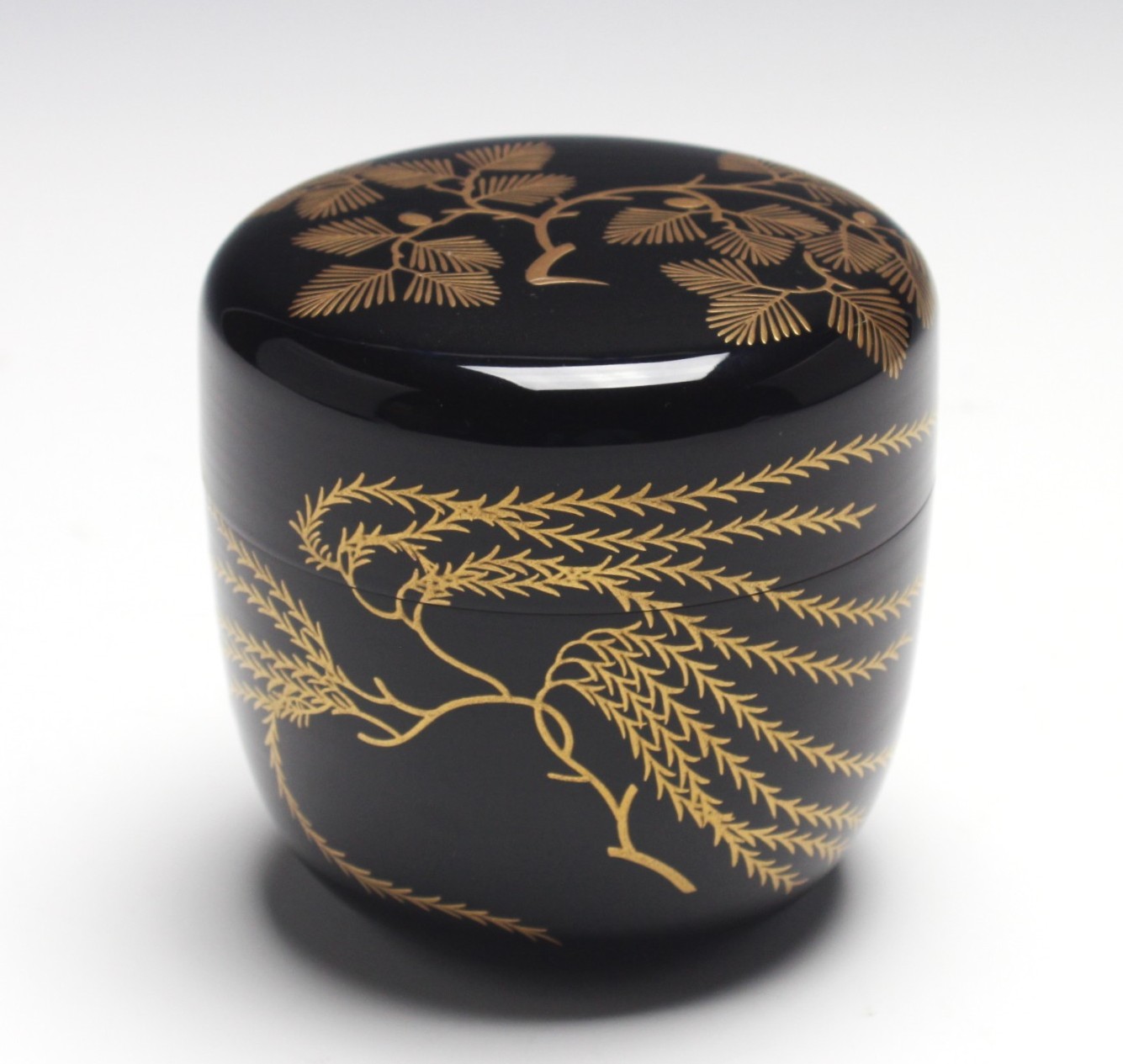 五代 川端近左 松柳蒔絵黒根来塗大棗 the 5th kawabata, kinsa big tea container with a picture of pine and willow tree